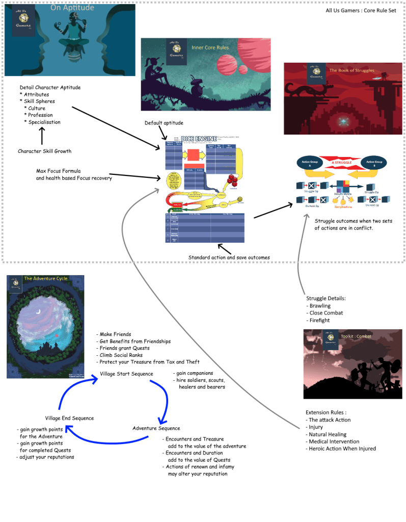 There has been a lot of play testing of the Adventure Cycle, at its peak 2 game masters and 16 players in 4 session streams each week. A lot of extra stuff has been developed in draft form, such as a magic system and dungeon crawl details. These will get polished up and provided later as Adventure Cycle Plugins.