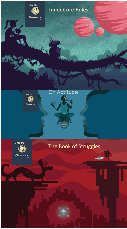 All Us Gamers is intended to allow a careful balance between number handling / dice rolling mechanics and the use of narrative style game play, where decisions are made based on descriptions, without resorting to dice at every step.