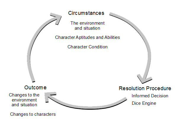 The Dice Engine produces graded outcomes between total disaster and incredible success, and the informed decision method is expected to produce similar outcomes by fiat. These outcomes then modify the circumstances, and play is ready to move on to another round of action or go out to extended, longer time frame activity.