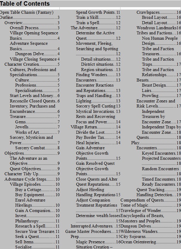 Here is the index to the Open Table Chassis – Fantasy as it has been cobbled together so far. Each section is mainly notes or bullet points in the actual document, although some is more fleshed out, having been used to play test the combat toolkit.