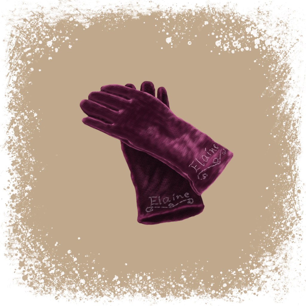 The beautifully embroidered, burgundy coloured, velvet gloves have the name “Elaine” stitched into their cuffs. They enhance the aptitude of the wearer by 2 whenever using agility to perform actions with their hands.