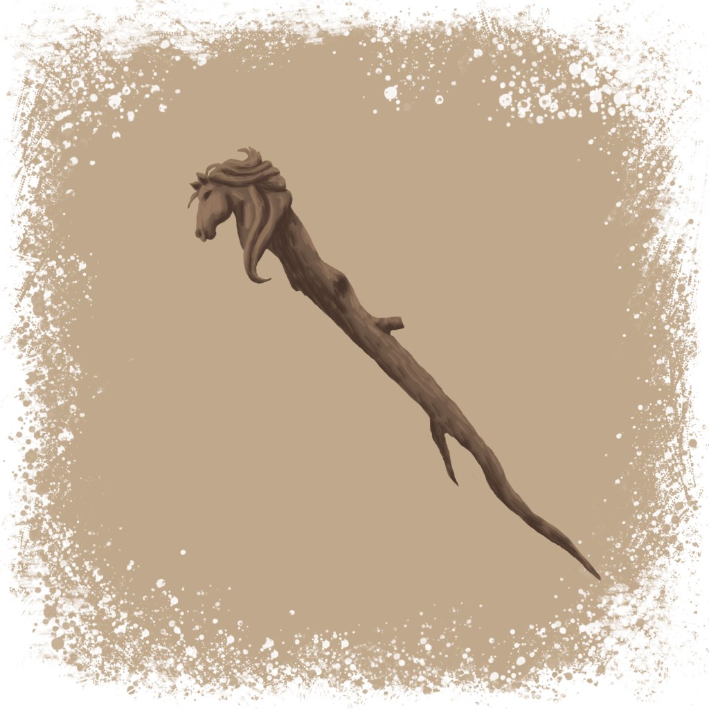 Durriken the Horseman crafted this stick from a tree deep in the forest where the wild and most hot blooded stallions would stop to drink during the winter migrations. He carved a handle in the likeness of a wild horses head with a flowing mane. The rest of the stick he left in its natural form. The stick, when used to lightly touch a horses cheek or stroke its neck would enhance the wielder’s ability to calm and befriend the animal.